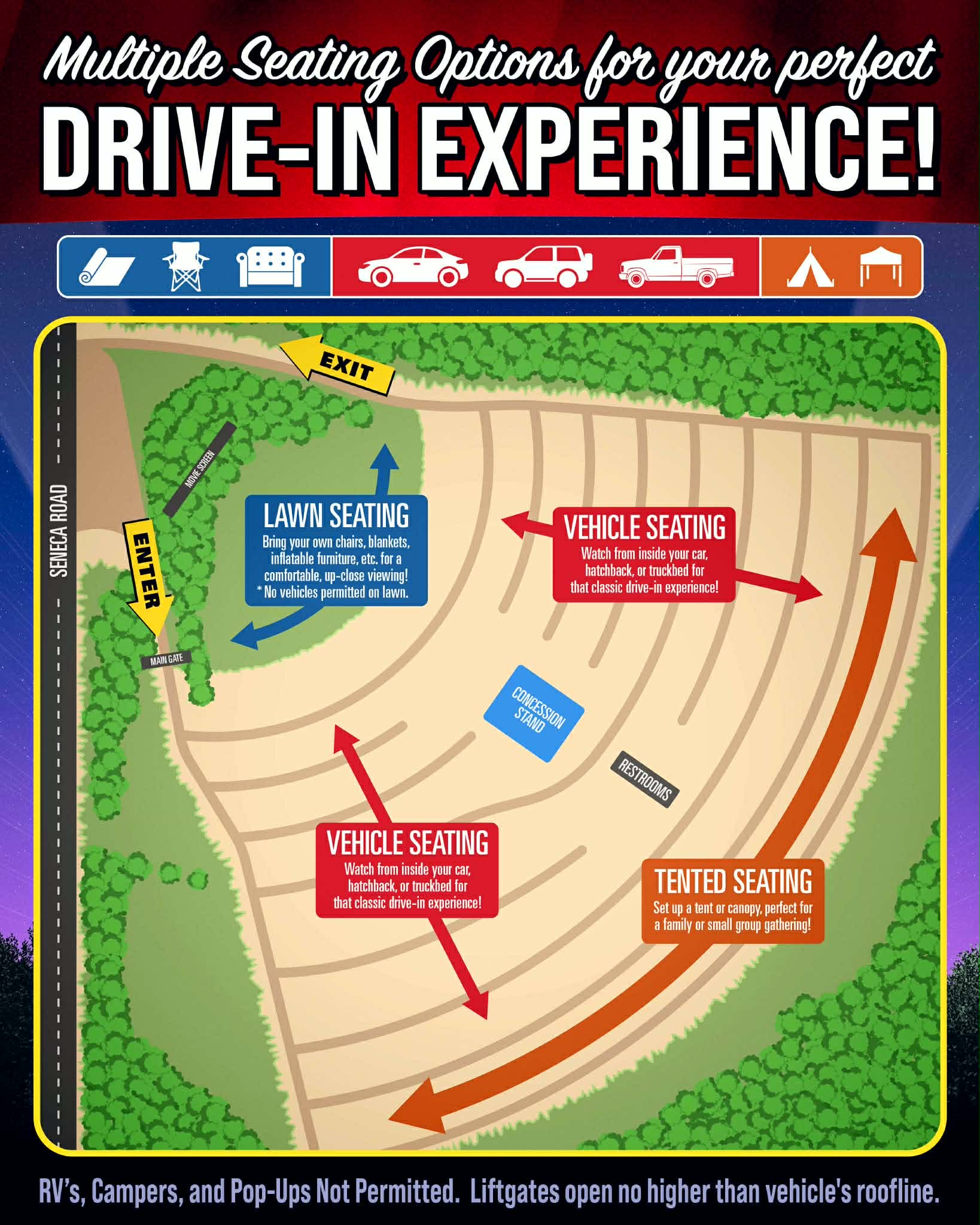 Please be respectful of your fellow drive-in fans. Sound tends to bounce of our giant screen to all corners of the lot, and conversations can be heard far from where you may be sitting. Many people drive far and wide to see their favorite films under the stars, and we'd hate to have that magic tainted by distracting behavior. Respect is key. We do not promote the consumption of alcoholic beverages, and please no smoking in the bathrooms.